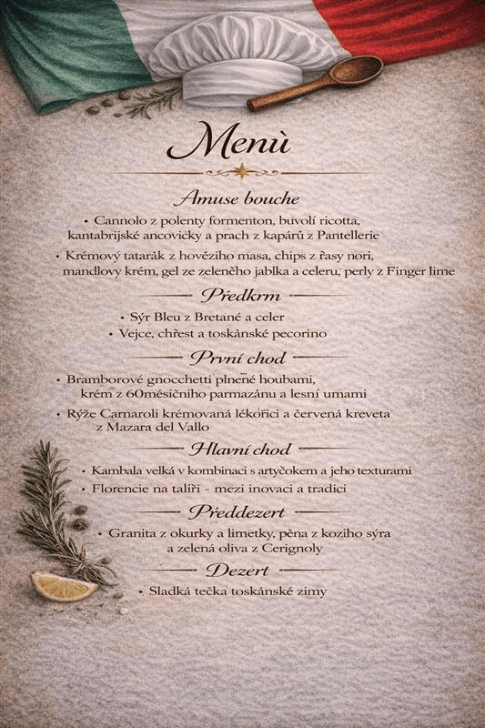 🍽️ Exkluzivní degustační večeře s Týmem italské národní kuchařské reprezentace, objevte menu večera.